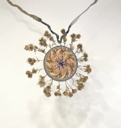 Acrylic and fabric on plywood, found plant, wire and fabric